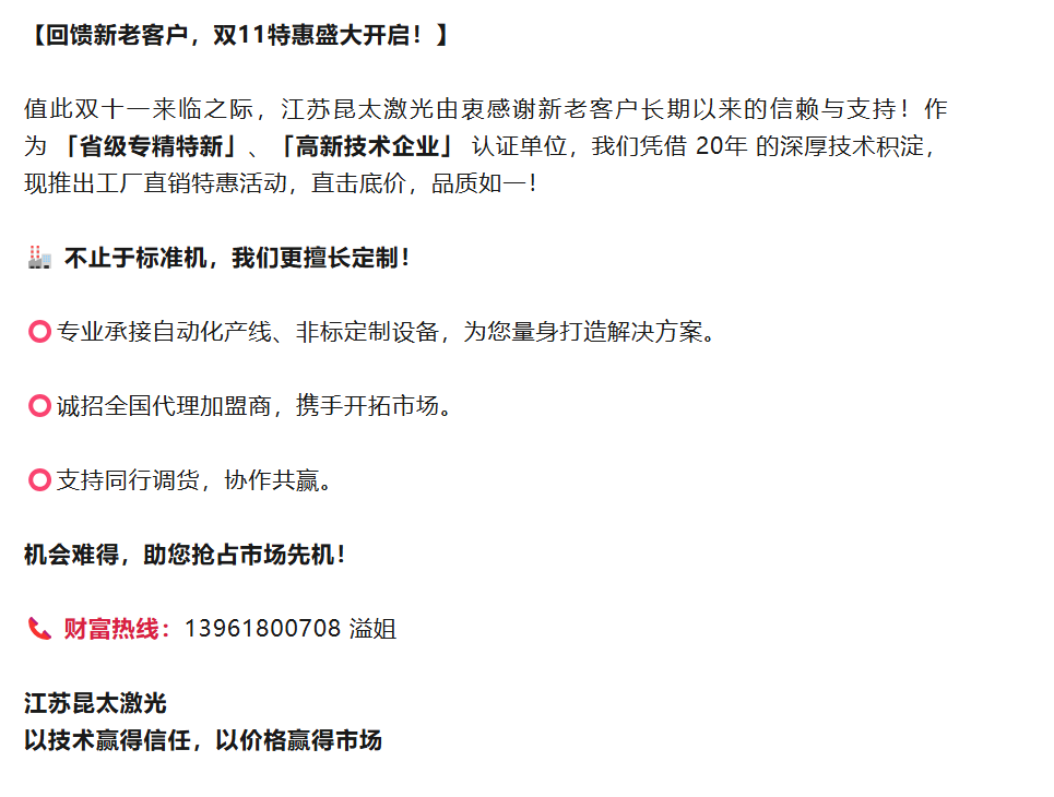 首先,衷心感謝各位對昆太激光的信任與支持!近年來,隨著昆太激光打標技術的飛速發展,我們很高興能通過新媒體平臺(如微信公眾號、視頻號、抖音等)與大家分享最新的技術成果與應用案例。